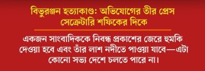 একই সুরে একজন বিশিষ্ট মানবাধিকার কর্মী বলেন, “বিভুরঞ্জন সরকারের ঘটনাটি বিচ্ছিন্ন নয়। এটি দেশে মতপ্রকাশের স্বাধীনতার ওপর চলমান আক্রমণের একটি ভয়ঙ্কর দৃষ্টান্ত। যখন গণমাধ্যমকে ভয় দেখিয়ে নিয়ন্ত্রণ করার চেষ্টা করা হয়, তখন পুরো সমাজই অনিরাপদ হয়ে পড়ে। এই মৃত্যু রাষ্ট্রের বিচারহীনতার সংস্কৃতিরই প্রতিফলন। আমরা অবিলম্বে একটি স্বাধীন ও নিরপেক্ষ বিচার বিভাগীয় তদন্ত কমিশন গঠনের দাবি জানাচ্ছি।”